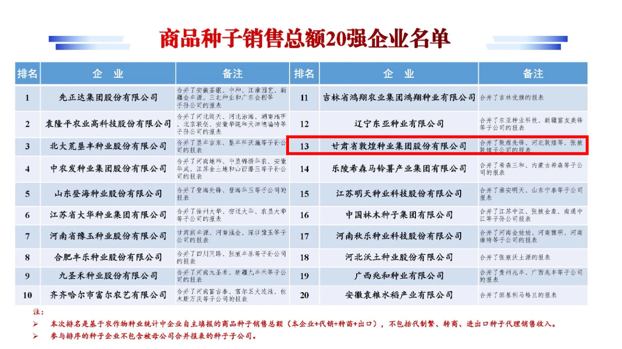 敦煌種業(yè)被第十六屆中國(guó)國(guó)際種業(yè)博覽會(huì)暨第二十一屆全國(guó)種子信息交流與產(chǎn)品交易會(huì)評(píng)為雜交玉米商品種子銷售總額10強(qiáng)企業(yè)、商品種子銷售總..[2024-11-04]